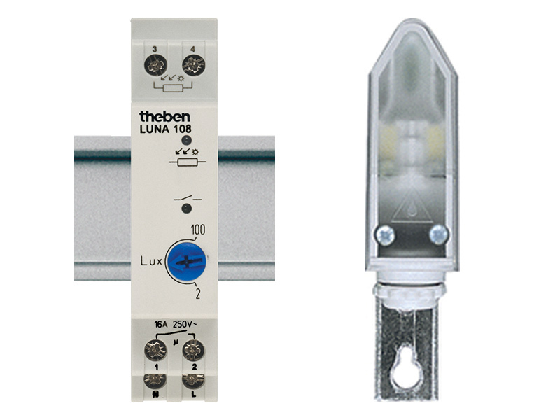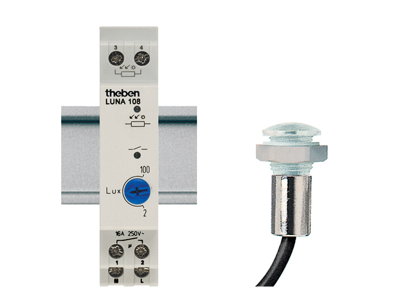 L'interrupteur crépusculaire analogique avec capteur à distance LUNA 108 est conçu pour un montage sur rail DIN ou mural, largeur 1 module.