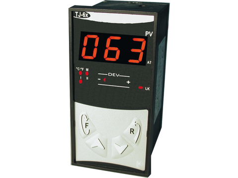 Il est muni de diodes lumineuses pour visualiser l'état de la sortie de régulation, l'état de la sortie alarme, de l'unité °C ou °F, de la déviation +/- ainsi que signaler le verrouillage des paramètres et la fonction self tuning.