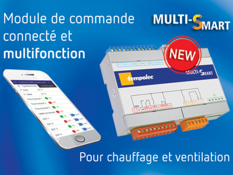 Le module de commande connecté et multifonction Multi-Smart est destiné à la commande d'une installation de chauffage ou à la commande de ventilateur dans une application avec déstratificateur ou free cooling.