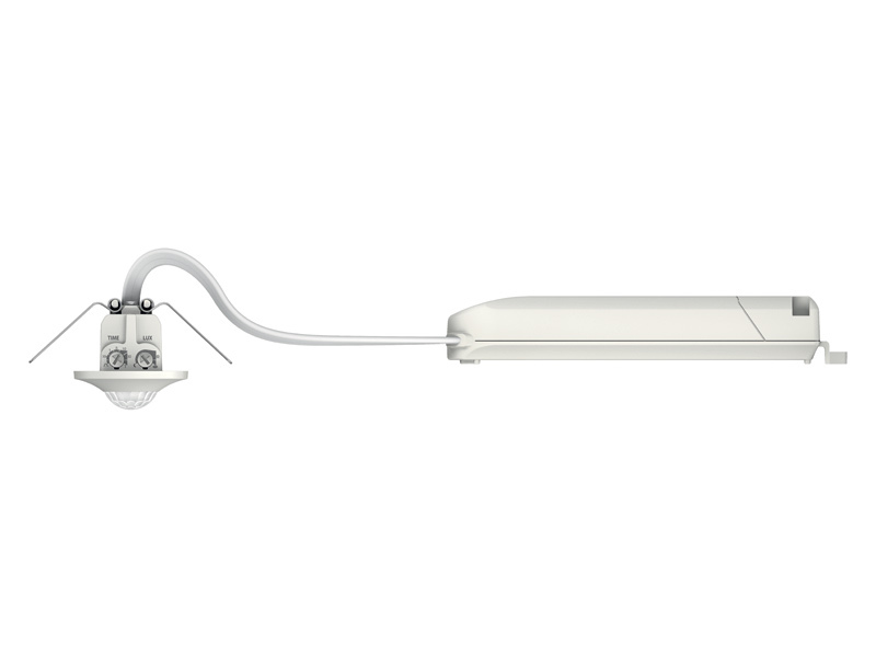 Le mini-détecteur de mouvements thePiccola S360-100 DE WH est prévu pour un montage encastré au plafond. Il ne mesure que 44 mm de diamètre. Le bloc d'alimentation se loge dans le faux plafond.