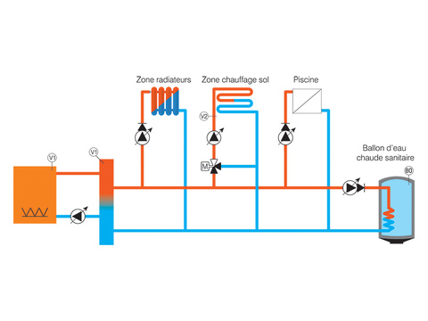 Les coffrets câblés ci-après conviennent pour les installations comprenant une zone de chauffage radiateurs, une zone de chauffage sol avec vanne mélangeuse, un chauffage piscine et une production d'eau chaude sanitaire.