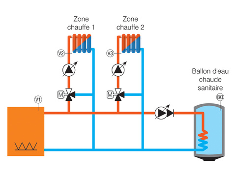 Les coffrets câblés ci-après conviennent pour les installations comprenant deux zones de chauffe avec vanne mélangeuse et une production d'eau chaude sanitaire.