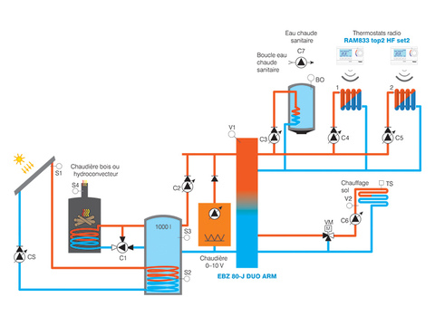 – un thermostat d'ambiance radio RAM833 top2 HF set 2 pour les deux circuits radiateurs