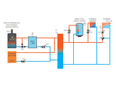 Il convient donc pour toute installation unifamiliale équipée d'un générateur de chaleur dont l'allumage est manuel (chaudière bois, insert, etc.) avec, par ex., une chaudière d'appoint, une zone chauffage sol, une zone chauffage radiateurs et une production d'eau chaude sanitaire.