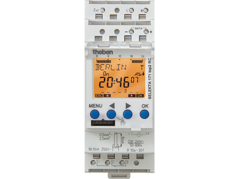 L' interrupteur SELEKTA 171 top2 RC permet d'enclencher/déclencher l'éclairage en fonction des heures de lever ou de coucher du soleil. Celles-ci varient selon la période de l'année et la situation géographique. L'horloge contient une base de données avec les pays et les villes importantes. Il suffit de sélectionner la ville la plus proche.