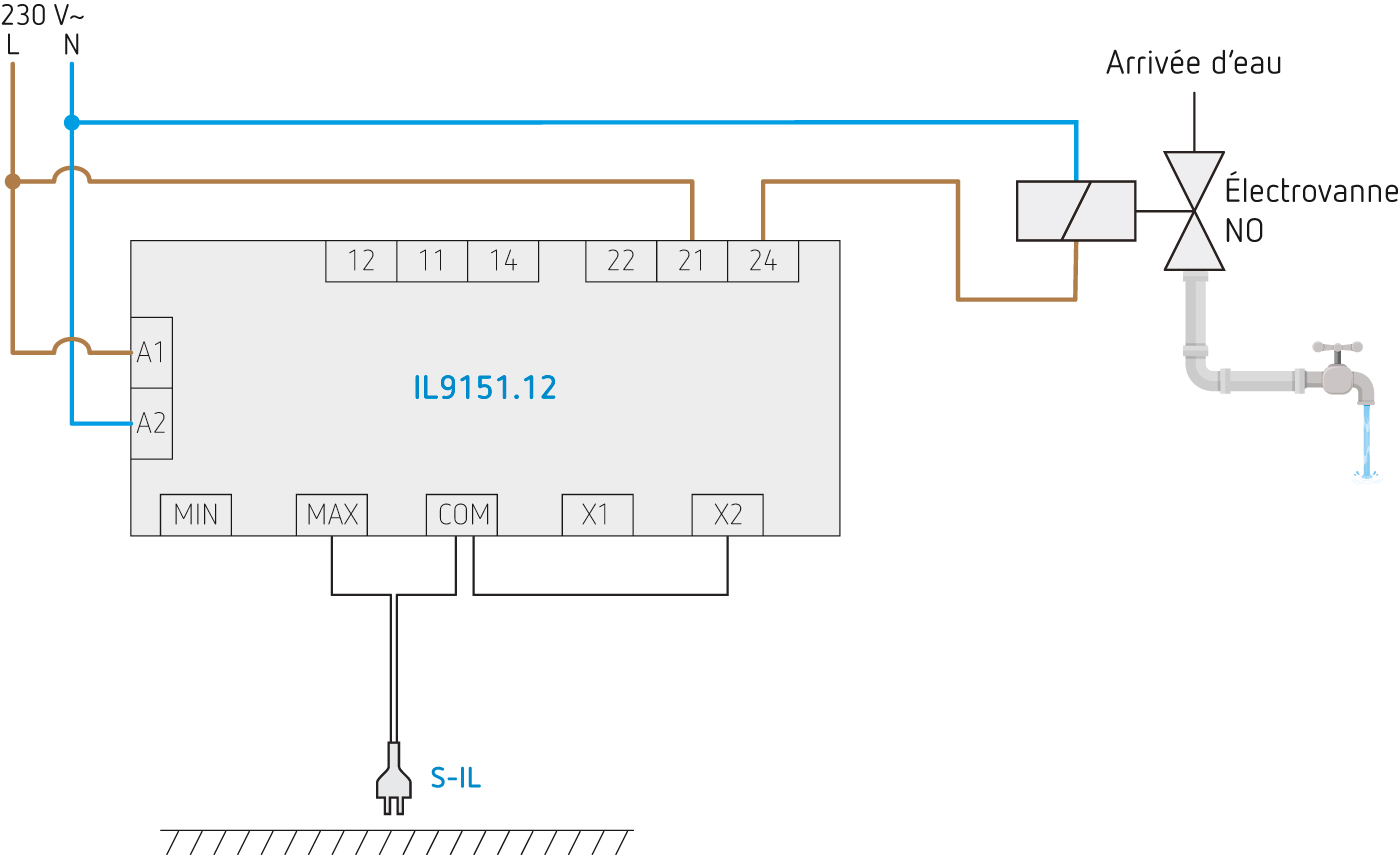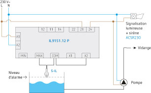Pour la mise en marche de pompes jusqu’à 600 W, 230 V AC, vous pouvez utiliser directement le contact du relais de niveau.