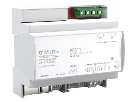 Système hi-fi pour montage sur rail DIN avec amplificateur intégré pour la lecture de sources de streaming et d’une source audio analogique dans une zone.