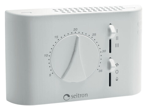 Thermostat pour ventilo-convecteurs avec interrupteur été/arrêt/hiver et sélecteur à glissière de vitesse du ventilateur. Le ventilateur peut être contrôlé par le thermostat ou fonctionner en permanence.