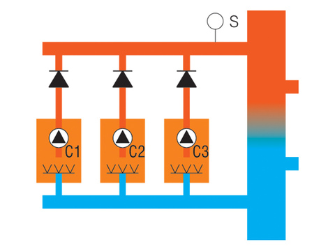 Le module cascade PHARAO II 10 avec programme GTE36.3-1 convient pour la commande en cascade de trois chaudières avec commande des circulateurs incorporés.