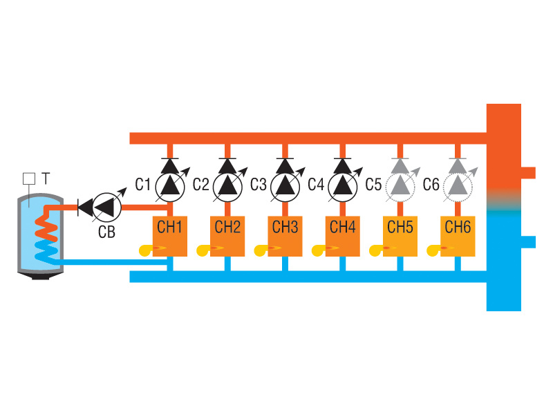 La production d'eau chaude sanitaire peut être réalisée par circulateur sur chaudière 1 ou par toutes les chaudières (eau chaude sanitaire dans le secondaire).
