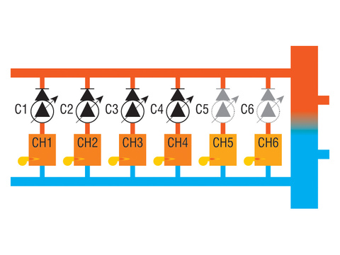 En cas de défaut de débit, les chaudières sont mises à l'arrêt. Le sens de la cascade est inversé deux fois par semaine (sauf chaudière 1 en cas de production d'eau chaude sanitaire dans le primaire).