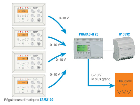 Le module logique PHARAO II 25 avec programme COMP 0-10 V est destiné à piloter une chaudière à condensation avec signal 0–10 V au départ de plusieurs régulateurs climatiques. Jusque 7 régulateurs climatiques peuvent être raccordés.
