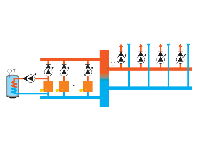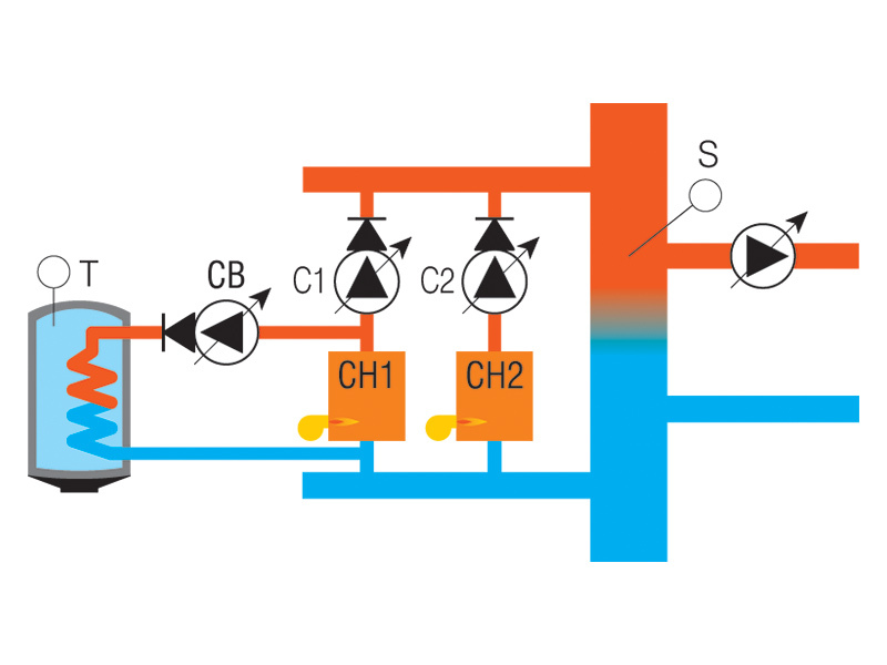 Bij installaties met groot vermogen of met verscheidene kringen, is het voordelig het verwarmingsvermogen te splitsen en aan te passen in functie van de werkelijke warmtebehoeften.