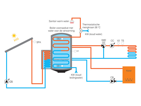 Hij is dus voorzien voor elke eengezinsinstallatie met bijv. een vloerverwarming met (voor)verwarming via zonnepanelen en een sanitair warmwaterproductie via geaccumuleerde zonne-energie.