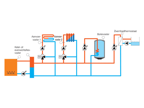 GT 2200-RP30 stuurt een ketel, twee mengkranen, een boilerlaadpomp, een primaire pomp, twee cv-pompen en een zwembadpomp.