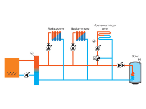 – een sanitair warmwaterproductie met voorrang t.o.v. de radiatorkring.