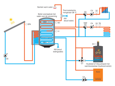 – een zonnesysteem voor sanitair warm water, vloerverwarming en radiatorverwarming