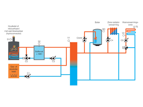 Hij is voorzien voor een eengezinsinstallatie met een warmtegenerator met manuele ontsteking (houtketel, inbouwcassette, enz.) en bijvoorbeeld, een ketel voor bijverwarming, een zone vloerverwarming, een zone radiatorverwarming en een sanitair warmwaterproductie.