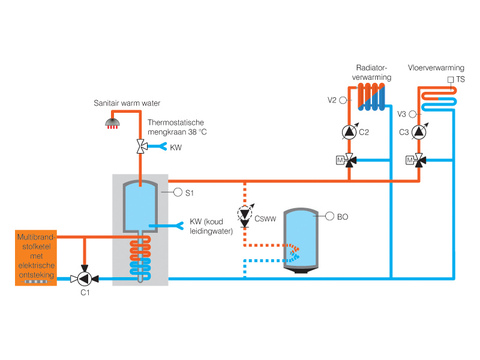 – een sanitair warmwaterproductie via aparte boiler indien deze niet in het buffervat is voorzien.
