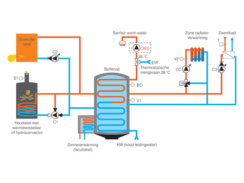 – een buffervat met warmtewisselaar voor sanitair warm water en eventuele warmtewisselaar op zonne-energie