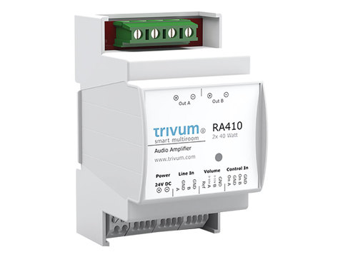 Universele versterker met 2x 40 watt uitgangsvermogen voor het aansturen van een extra zone op de line-out van de TRIVUM REG RP311-300014 of RP341-30016 audioactuators.