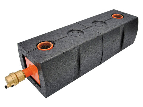 De verticale evenwichtsfles DN 25 met isolatie wordt gebruikt om de verwarmingsaanvoer en -retour hydraulisch te ontkoppelen. Dit is vooral nodig als er meerdere verwarmingscircuits worden gebruikt, omdat de druk in de verwarmingscircuits verschilt door de verschillende debieten van de pompen.